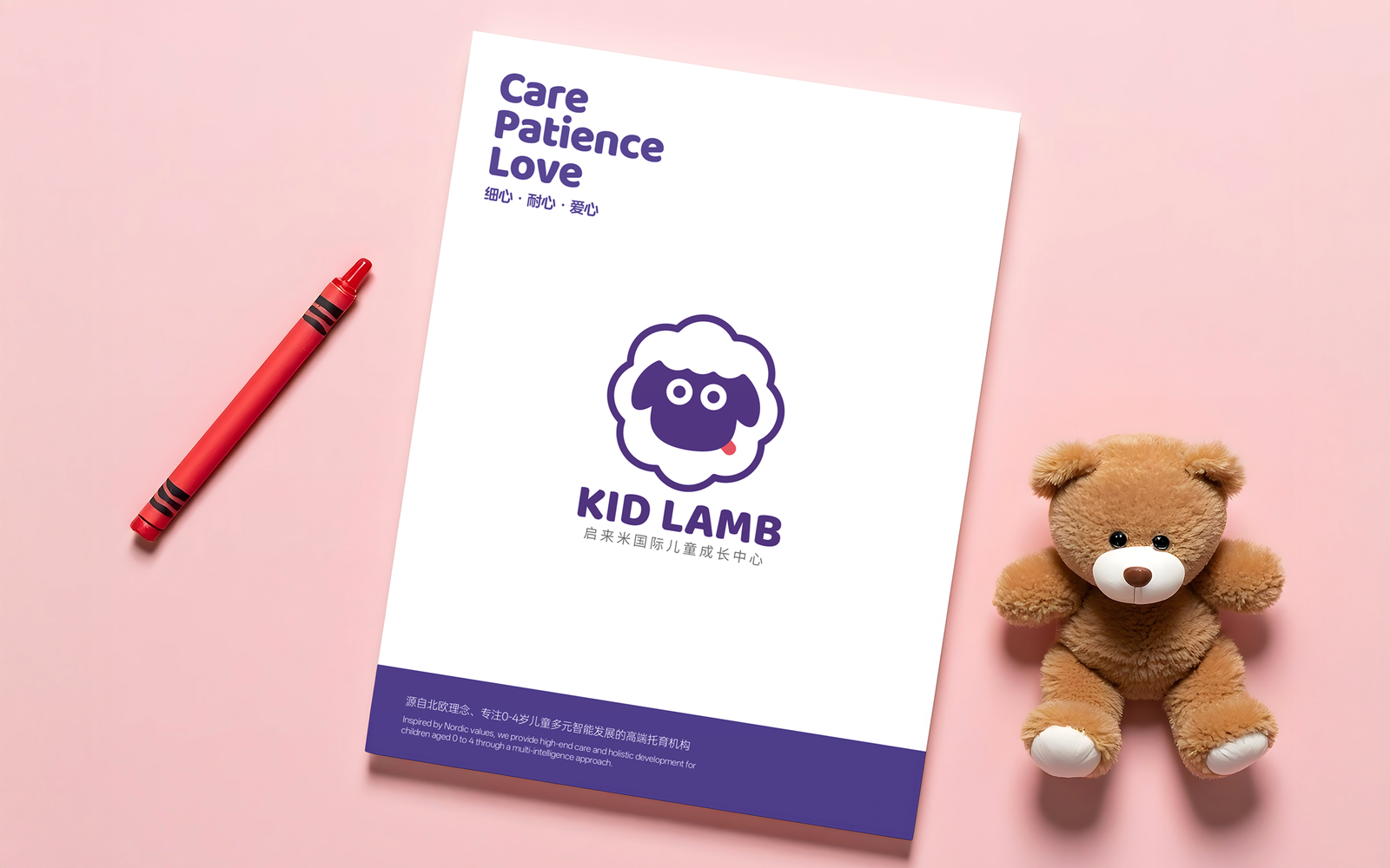 The outer silhouette adopts the shape of soft, full petals, symbolizing the idea that “children are the blossoms of the nation,” while also reflecting the brand’s focus on early education. The lamb’s face contrasts deep purple and white to ensure strong visual recognition—stable in form, yet full of playfulness.